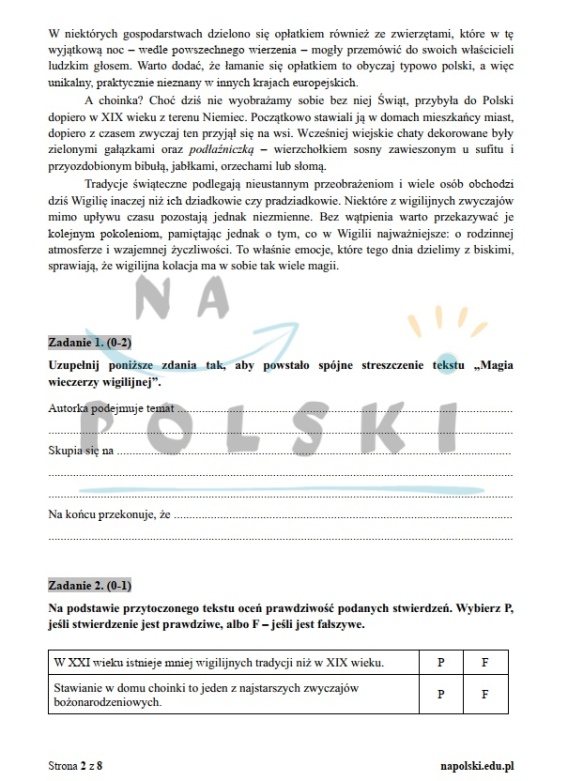 W arkuszu znajduje się 10 zadań, z czego część to pytania otwarte, a część - zamknięte. Większość pytań dotyczy treści artykułu, a więc sprawdza bezpośrednio umiejętność czytania ze zrozumieniem. Pozostałe pytania dotyczą zagadnień gramatycznych i językowych oraz analizy materiału ikonograficznego (reprodukcja obrazu). Jedno z poleceń wymaga sformułowania krótkiej wypowiedzi argumentacyjnej, jedno - krótkiej formy tekstowej, czyli napisania świątecznych życzeń. Za zadania można zdobyć łącznie 15 punktów.
