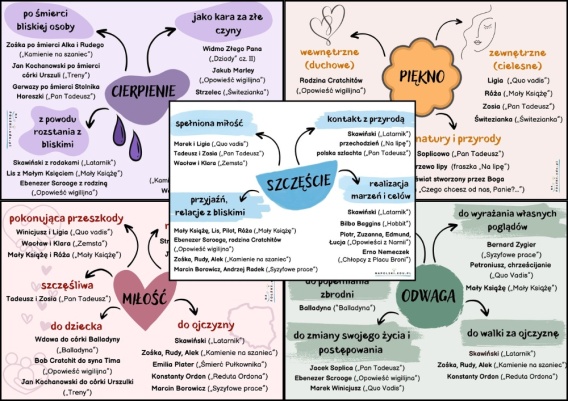 Oferowany pakiet zawiera pięć plansz edukacyjnych, które prezentują różnorodne ujęcia motywów literackich, jakimi są szczęście, miłość, odwaga, piękno i cierpienie. Przy każdym motywie umieszczone są tytuły lektur, które zawierają określony motyw. Są to lektury obowiązkowe na poziomie klas V-VIII szkoły podstawowej, a zarazem wymagane na egzaminie ósmoklasisty z języka polskiego w roku 2026.