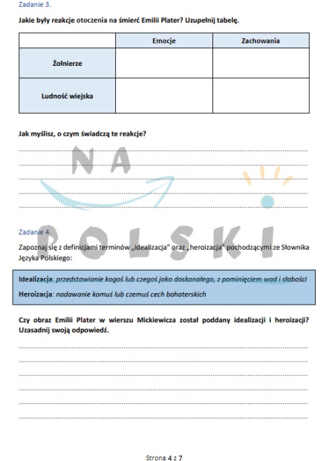 Plik ma 8 stron i format PDF. Pierwsza część materiału zawiera zadania otwarte odnoszące się bezpośrednio do treści i problematyki lektury. W drugiej części przytoczony został artykuł popularnonaukowy opowiadający o życiu Emilii Plater. Do tego tekstu skonstruowane zostały trzy pytania - sprawdzające umiejętność czytania ze zrozumieniem i formułowania na podstawie tekstu własnej opinii.