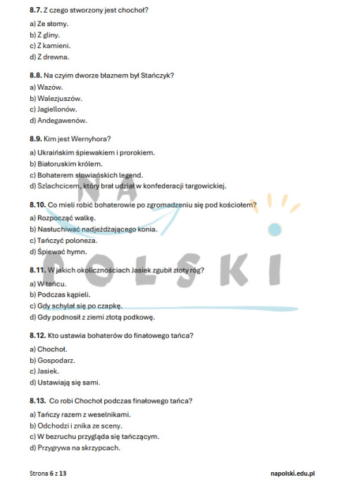 Ten materiał edukacyjny mogą nabyć nauczyciele i wykorzystać go w szkole jako sprawdzian z języka polskiego. Z pewnością przyda się także uczniom, którzy chcą powtórzyć wiadomości przed szkolnym sprawdzianem z "Wesela". Test będzie też świetną powtórką przed egzaminem maturalnym. Do wszystkich pytań przygotowane zostały odpowiedzi, dzięki czemu bez problemu można zweryfikować poziom swojej wiedzy.